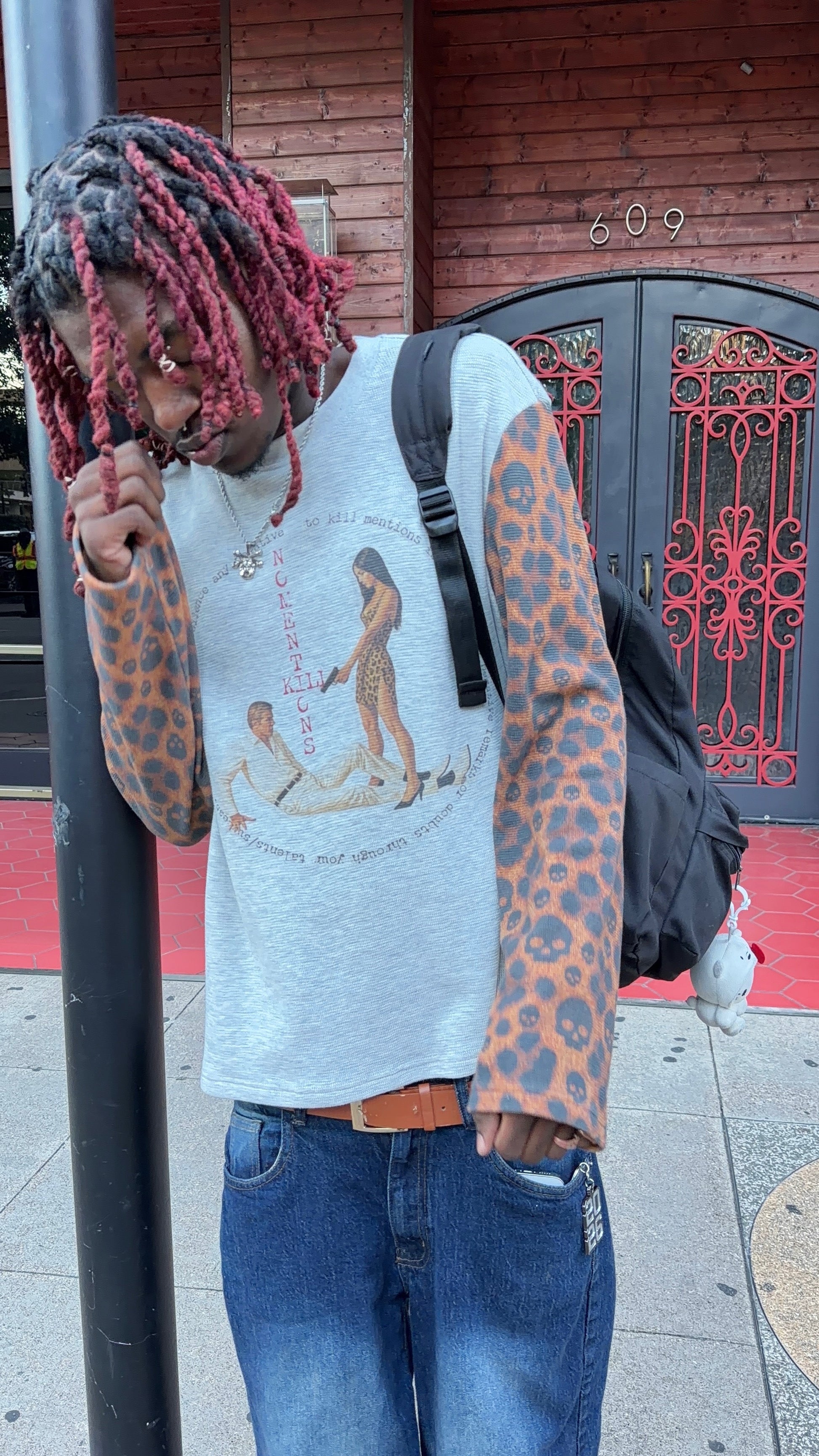 This “Empty Feeling” thermal is all about killing mentions without saying a word — the art of letting your growth silence everything they ever said. The washed cream body sets the tone, the wild leopard sleeves bring the bite, and the graphic tells the whole story: she’s standing over him not for power, but to symbolize how you rise over negativity, rumors, and doubt. The circular text becomes a mantra — no energy to anything that tries to pull you down. It’s a piece about control, silence, and revenge through elevation. A reminder that you don’t argue… you outperform.